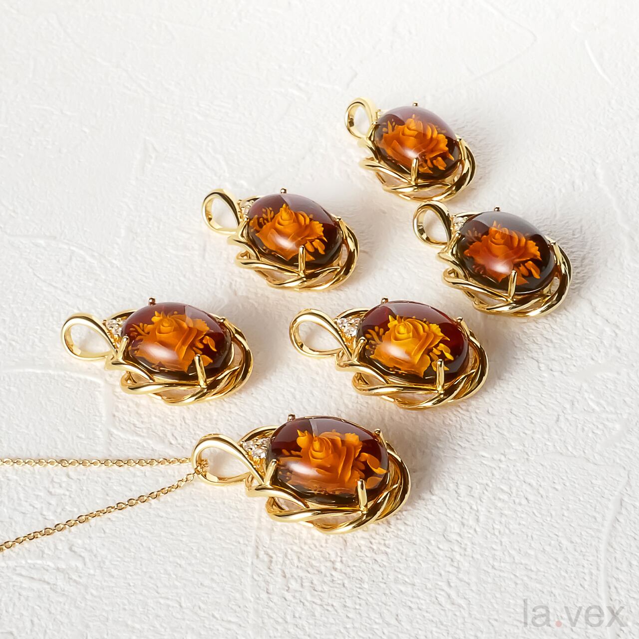 琥珀の裏側に手彫りで薔薇を彫刻してます。
